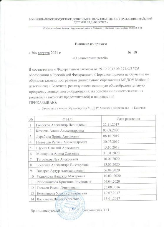 Распорядительный акт о зачислении ребенка в образовательную организацию
